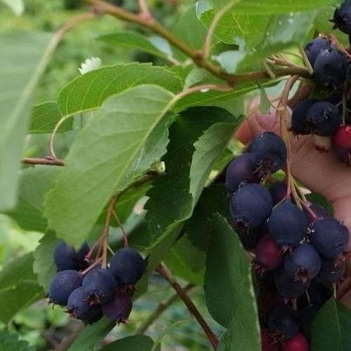 A large hardy, North American shrub with excellent blueberry-like fruits, the Russian bred variety Krasnojarskaja produces fruit that is a dark pink to blue color with a refreshing, sweet to slightly sour taste. This hardy shrub is both attractive and productive: white blossom covers the plant in May, followed by a good crop of edible berries in July. A compact and high-yielding variety of domestic selection. On average it yields 4kg of berries per year. Bee and wildlife friendly. Self fertile.
