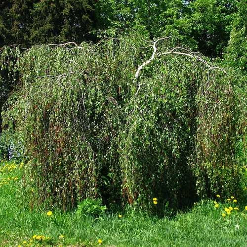 A weeping cultivar of the native silver birch, Betula pendula Tristis is a medium-sized to tall deciduous tree with a narrow crown, slender branches and gracefully drooping, twisting twigs. Average growth rate. The bark is white, peeling like the species; dark fissures develop as the tree ages. Long, brownish male catkins appear in mid-spring; the upright, female flowers release tiny winged seeds over winter. The leaves are small, delicate and heart-shaped, light green, turning yellow in autumn. Its grace and beauty are best appreciated when grown as a specimen in the larger garden; despite its weeping habit it retains a central leader, making it a perfect specimen tree. Particularly lovely when covered with frost in winter. Holds the RHS Award of Garden Merit.