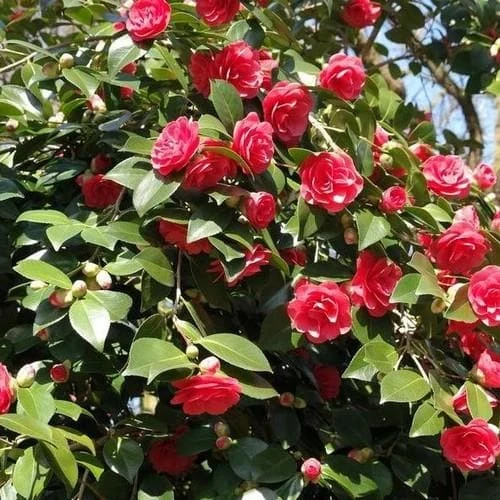 A compact, upright evergreen shrub with very dark green leaves. Medium sized double rose-red flowers, sometimes with fine white edges. Strong grower.