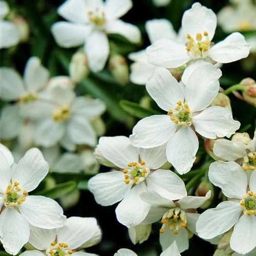 Easy, reliable, attractive and scented to boot, Choisya Ternata Aztec Pearl earns its place in almost any garden. It’s a medium-sized, fast-growing, evergreen shrub with a neat, open, mounded habit. The leaves are divided into 3-5 narrow leaflets, and a glossy deep-green, deliciously scented of orange-blossom. In May, it bears citrus-scented white flowers tinged with pink, and will often flower again in late summer, especially in a hot year. Flowers best in full sun. Good as a hedge or a border specimen, Mexican orange blossom Aztec Pearl holds the RHS Award of Garden Merit. Attractive to bees.