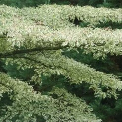 Large deciduous shrub or compact small tree. In spring, small purplish green flowers are surrounded by large creamy white bracts, making an excellent show. Sometimes followed by strawberry-like red fruits. Brilliant autumn foliage colour of orange, reds and purple. Hybrid of Cornus florida x Cornus nuttallii. Holds the RHS award for garden merit.