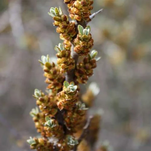 A German-developed male cultivar of the sea buckthorn, Hippophae rhamnoides ‘Pollmix’ does not bear fruit, but is offered as a suitable pollinator for up to 10 female sea buckthorns, including ‘Askola’. A medium – to fast-growing, deciduous shrub with dark green leaves, silver below, particularly suitable for coastal sites or stabilising dunes. Vigorous; tolerates drought.