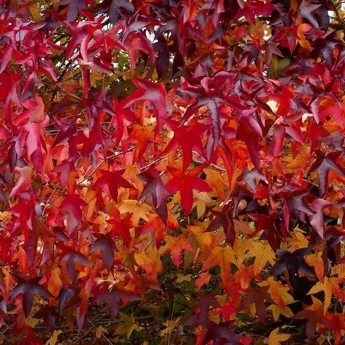 A very fine cultivar of sweet gum, ideal for a woodland planting or as a specimen, Liquidambar styraciflua Lane Roberts is a very tall, deciduous tree with an upright, spreading habit. The maple-like leaves emerge glossy mid-green, and turn wonderful shades of rich blackish-crimson in autumn. The clusters of inconspicuous flowers are yellowish, and are followed, after a warm summer, by green, burr-like fruits in autumn. Drought-tolerant once established, it needs minimal pruning. Sweet gum Lane Roberts holds the RHS Award of Garden Merit.