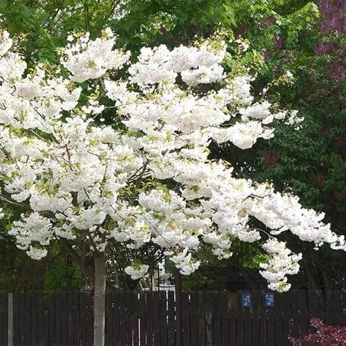 Named after Japan’s iconic Mount Fuji, Prunus Shirotae is a small, deciduous tree with a weeping habit when young, taking on the typical flat-topped, spreading Japanese cherry appearance as it matures. It is one of the earliest Japanese flowering cherries to bloom, covered in mid-April with large, pure white, scented, semi-double flowers, 5cm across, before the leaves emerge. The leaves are mid-green with a serrated edge, turning yellow and orange in autumn. Holds the RHS Award of Garden Merit.