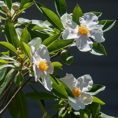 A fairly rare intergeneric hybrid between a Franklinia and a Gordonia, x Gordlinia grandiflora is a large, fast-growing, semi-evergreen shrub or small tree grown for its beautiful flowers and autumn colour. Narrow-elliptical, evergreen leaves, dark green above and paler green below, take on shades of orange and red in autumn, but usually succumb to frost in winter. Large white camellia-like flowers with brilliant golden stamens and a light, sweet scent, attractive to butterflies, are borne in late August and September. Gordlinia makes a good specimen shrub, or can be grown among other acid-loving evergreen shrubs like rhododendrons and camellias, but it is not the easiest to grow, and not for colder areas.