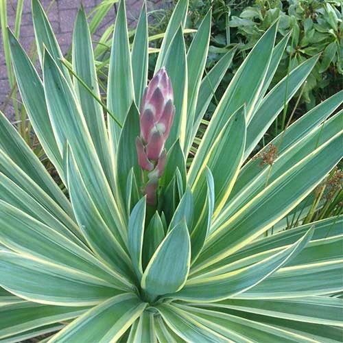 Ideal for an architectural effect in a courtyard or by the sea, Yucca gloriosa Variegata is a medium-sized, slow-growing, single-stemmed shrub with a handsome rosette of long, rigid, lance-shaped, blue-green leaves edged with creamy-yellow and with a sharp spine at the tips. From August to October, wide panicles of cream, bell-shaped flowers rise above the leaves. Rabbit- and drought-resistant. Do not plant near a path, or where young children have access, as the spines at the leaf-tips are very sharp. Variegated Spanish dagger holds the RHS Award of Garden Merit.